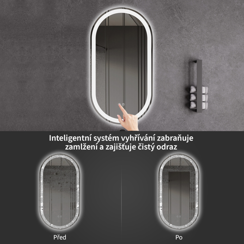 Osvětlení zrcadla lze snadno a pohodlně zapnout dotykem přepínače na panelu zrcadla. Umožňuje rychlé nastavení osvětlení bez nutnosti sahat po vzdálenějším tradičním vypínači.