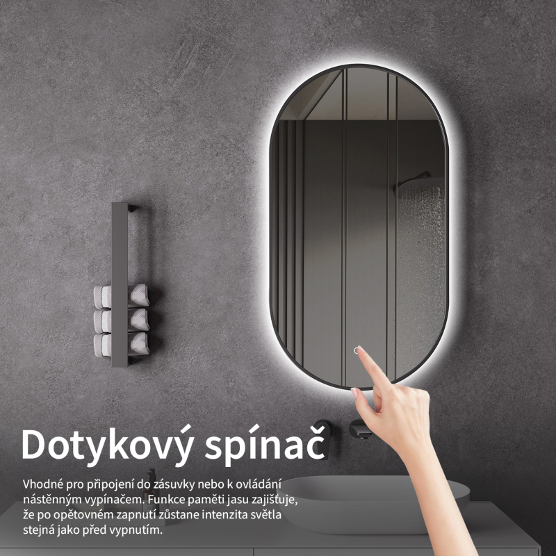 Osvětlení zrcadla lze snadno a pohodlně zapnout dotykem přepínače na panelu zrcadla. Umožňuje rychlé nastavení osvětlení bez nutnosti sahat po vzdálenějším tradičním vypínači.