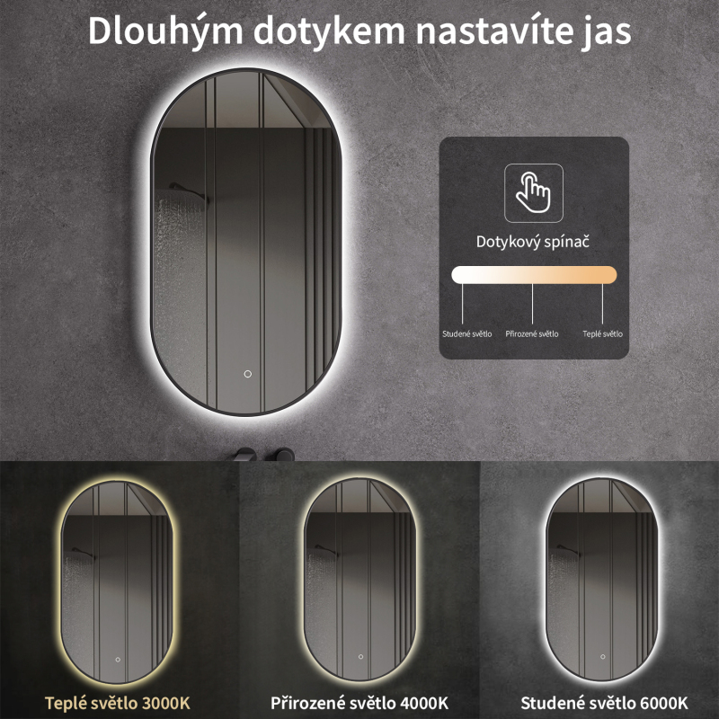 Zrcadlo je vybaveno LED osvětlením s nastavitelnou barvou světla – od 3000 K (teplá) do 6000 K (Neutrální). Přepínání barev jednoduše ovládáte dotykovým tlačítkem na ploše zrcadla. Poskytuje intenzivní a jasné světlo pro detailní péči i příjemné, jemné osvětlení pro relaxaci. Díky širokému rozsahu teploty barev tak snadno přizpůsobíte atmosféru aktuální potřebě.