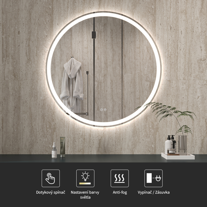 Zrcadlo je vybaveno LED osvětlením s nastavitelnou barvou světla – od 3000 K (teplá) do 6000 K (Neutrální). Přepínání barev jednoduše ovládáte dotykovým tlačítkem na ploše zrcadla. Poskytuje intenzivní a jasné světlo pro detailní péči i příjemné, jemné osvětlení pro relaxaci. Díky širokému rozsahu teploty barev tak snadno přizpůsobíte atmosféru aktuální potřebě.