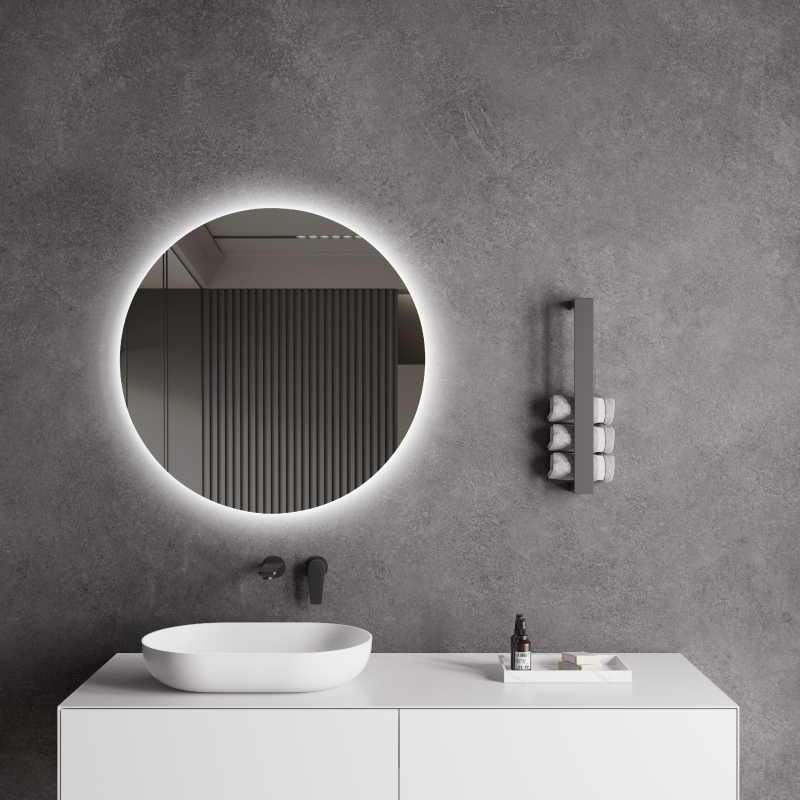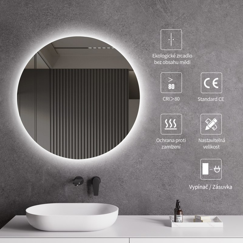 Zrcadlo je vybaveno zadním LED podsvícením, které svítí směrem ke stěně a vytváří jemný světelný efekt po celém obvodu. Rozptýlené světlo je vyzařováno z prostoru mezi rámem a zrcadlem, neoslňuje, zajišťuje rovnoměrné a příjemné nasvětlení prostoru koupelny.