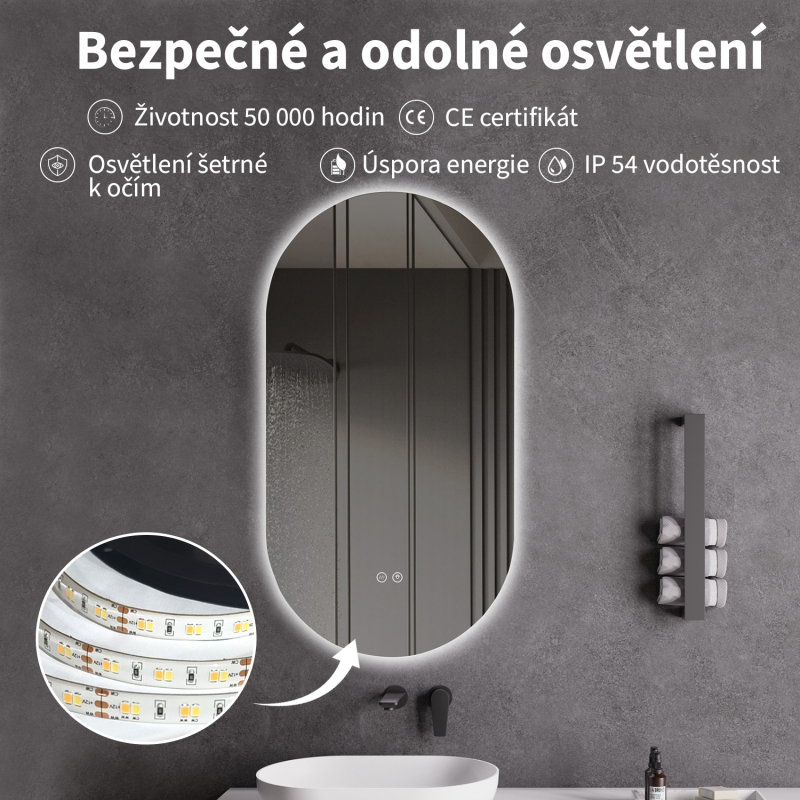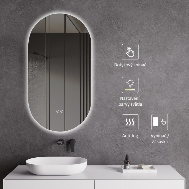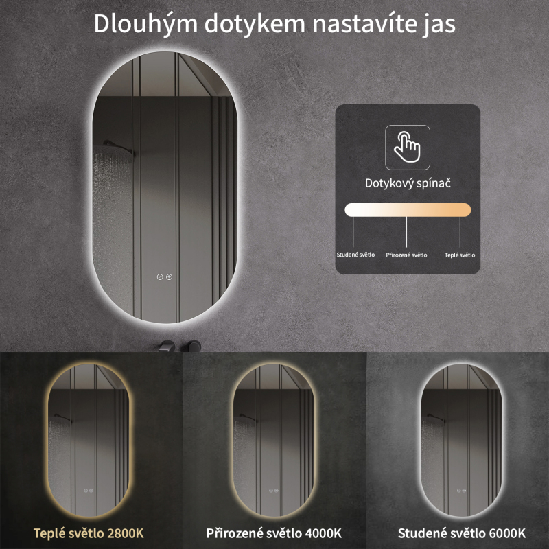 Zrcadlo je vybaveno LED osvětlením s nastavitelnou barvou světla – od 2800K (teplá) do 6000K (Neutrální). Poskytuje intenzivní a jasné osvětlení pro detailní péči i příjemné a jemné světlo pro relaxaci. Díky širokému rozsahu teploty barev lze přizpůsobit atmosféru dle potřeby.