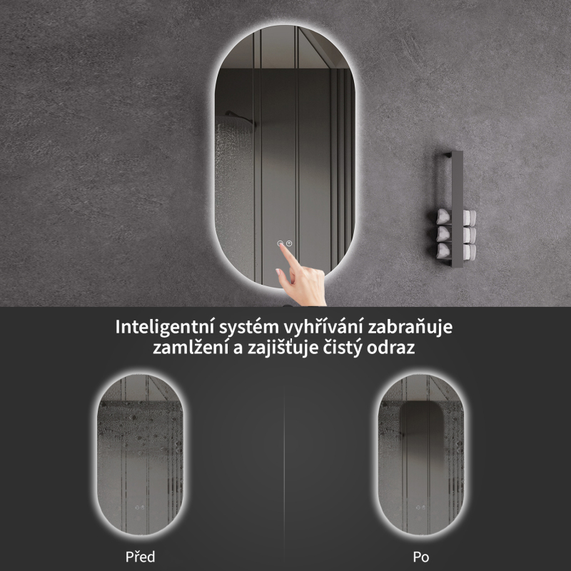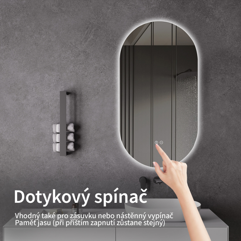 Osvětlení zrcadla lze snadno a pohodlně zapnout dotykem přepínače na panelu zrcadla. Umožňuje rychlé nastavení osvětlení bez nutnosti sahat po vzdálenějším tradičním vypínači.
