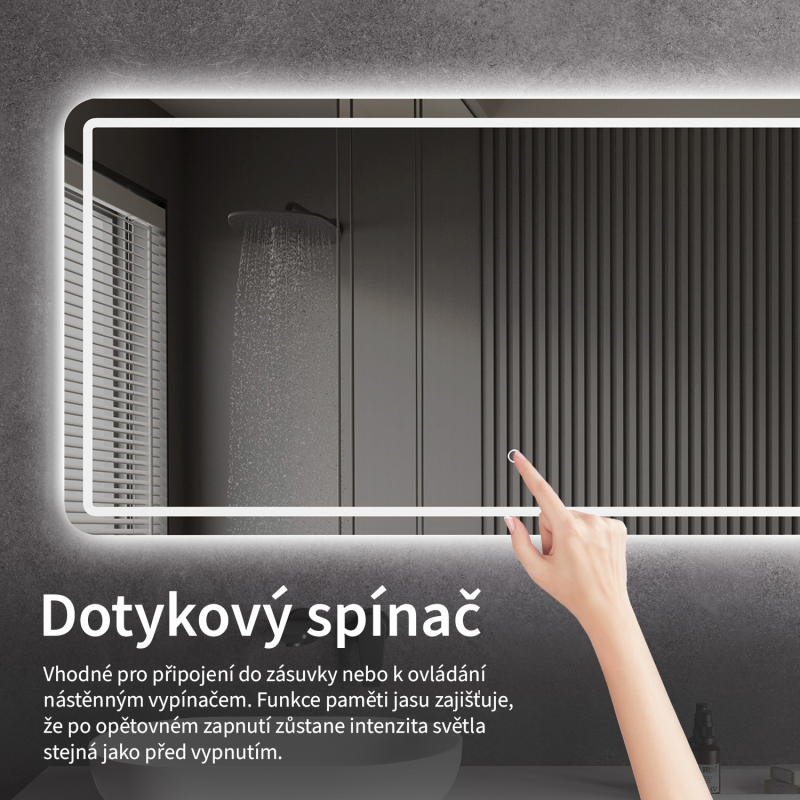 Osvětlení zrcadla lze snadno a pohodlně zapnout dotykem přepínače na panelu zrcadla. Umožňuje rychlé nastavení osvětlení bez nutnosti sahat po vzdálenějším tradičním vypínači.