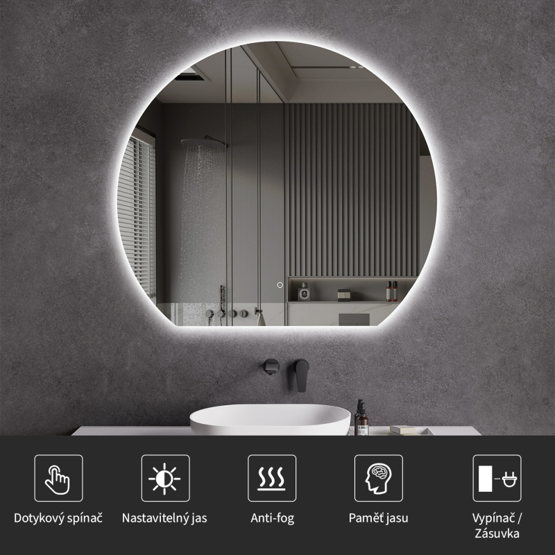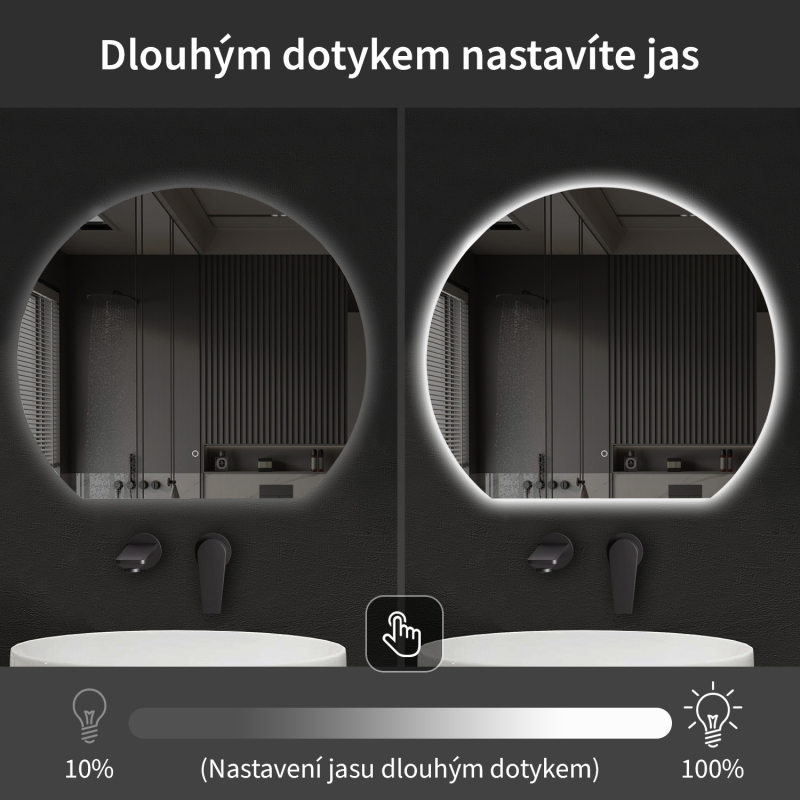 Osvětlení zrcadla lze snadno a pohodlně zapnout dotykem přepínače na panelu zrcadla. Umožňuje rychlé nastavení osvětlení bez nutnosti sahat po vzdálenějším tradičním vypínači.