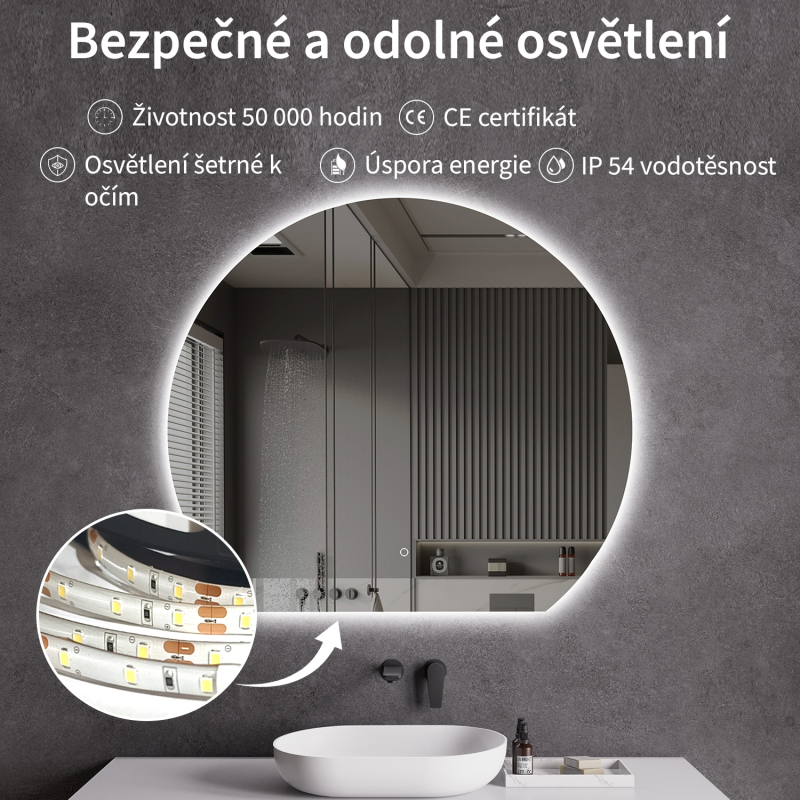 Zrcadlo je vybaveno LED osvětlením v neutrální barvě – 6000-6500K. Poskytuje intenzivní a jasné osvětlení, které umožňuje vidět i ty nejmenší detaily. Ideální pro každodenní péči o pleť.