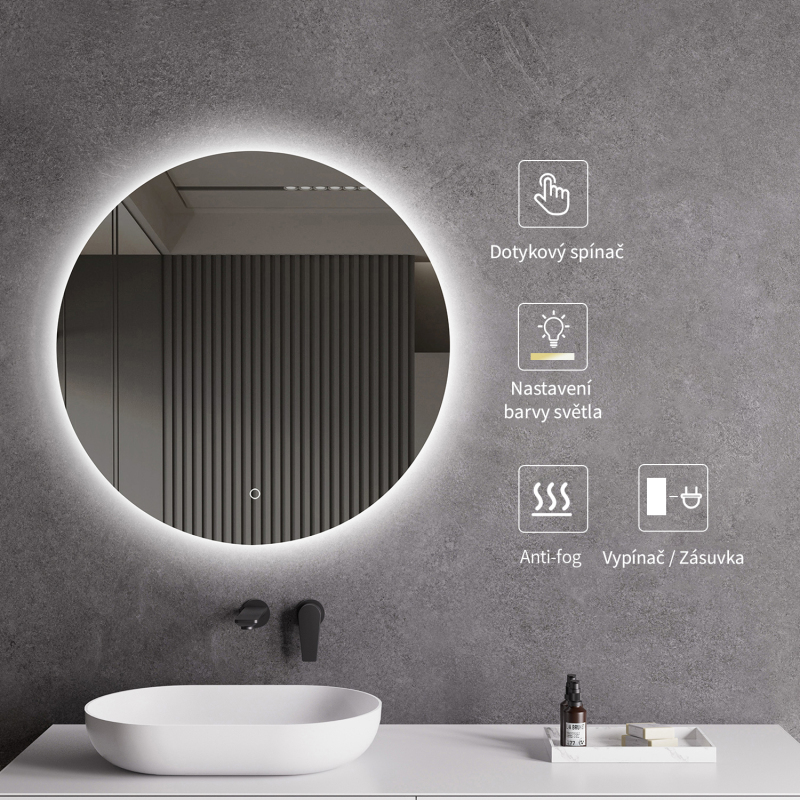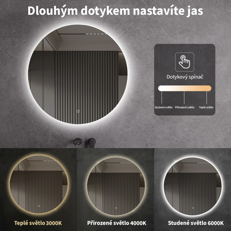Zrcadlo je vybaveno LED osvětlením s nastavitelnou barvou světla – od 3000 K (teplá) do 6000 K (Neutrální). Přepínání barev jednoduše ovládáte dotykovým tlačítkem na ploše zrcadla. Poskytuje intenzivní a jasné světlo pro detailní péči i příjemné, jemné osvětlení pro relaxaci. Díky širokému rozsahu teploty barev tak snadno přizpůsobíte atmosféru aktuální potřebě.