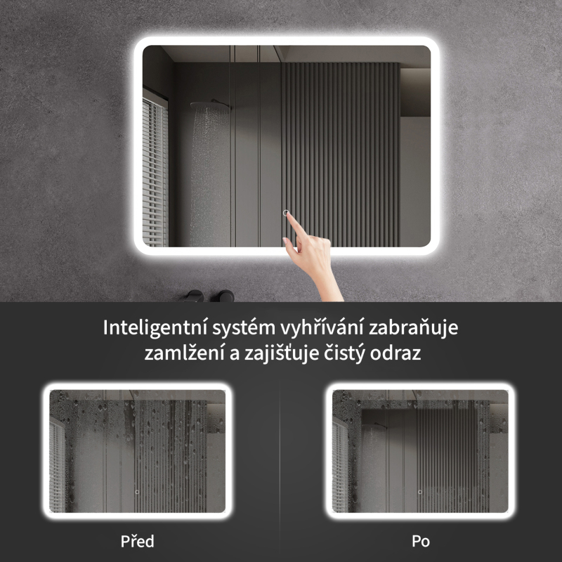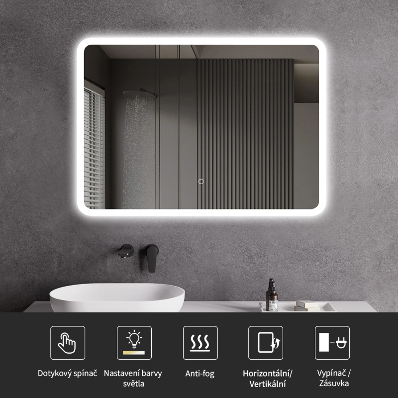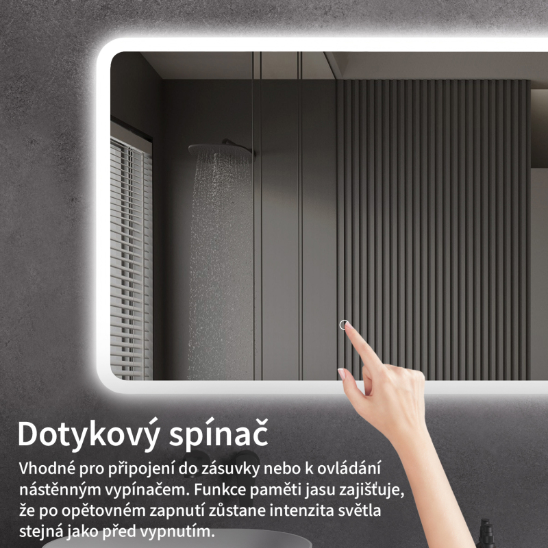 Osvětlení zrcadla lze snadno a pohodlně zapnout dotykem přepínače na panelu zrcadla. Umožňuje rychlé nastavení osvětlení bez nutnosti sahat po vzdálenějším tradičním vypínači.