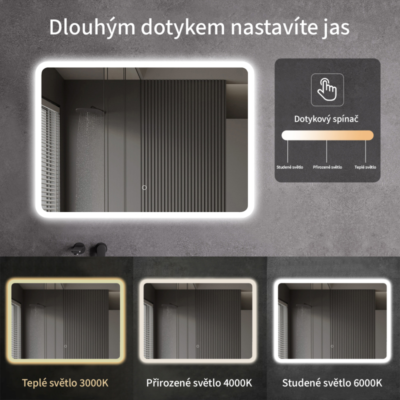 Zrcadlo je vybaveno LED osvětlením s nastavitelnou barvou světla – od 3000 K (teplá) do 6000 K (Neutrální). Přepínání barev jednoduše ovládáte dotykovým tlačítkem na ploše zrcadla. Poskytuje intenzivní a jasné světlo pro detailní péči i příjemné, jemné osvětlení pro relaxaci. Díky širokému rozsahu teploty barev tak snadno přizpůsobíte atmosféru aktuální potřebě.