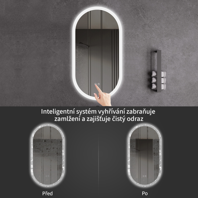 Osvětlení zrcadla lze snadno a pohodlně zapnout dotykem přepínače na panelu zrcadla. Umožňuje rychlé nastavení osvětlení bez nutnosti sahat po vzdálenějším tradičním vypínači.
