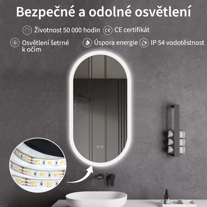 Zrcadlo je vybaveno LED osvětlením s nastavitelnou barvou světla – od 2800K (teplá) do 6000K (Neutrální). Poskytuje intenzivní a jasné osvětlení pro detailní péči i příjemné a jemné světlo pro relaxaci. Díky širokému rozsahu teploty barev lze přizpůsobit atmosféru dle potřeby.
