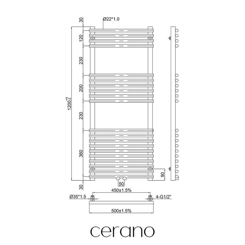 Standartní připojení radiátoru je 1/2" , což zajišťuje kompatibilitu s ventily a přípojnými sadami Cerano ,i od jiných výrobců. Ujistěte se, že všechny součásti odpovídají tomuto průměru, aby byl zajištěn bezpečný a efektivní provoz.