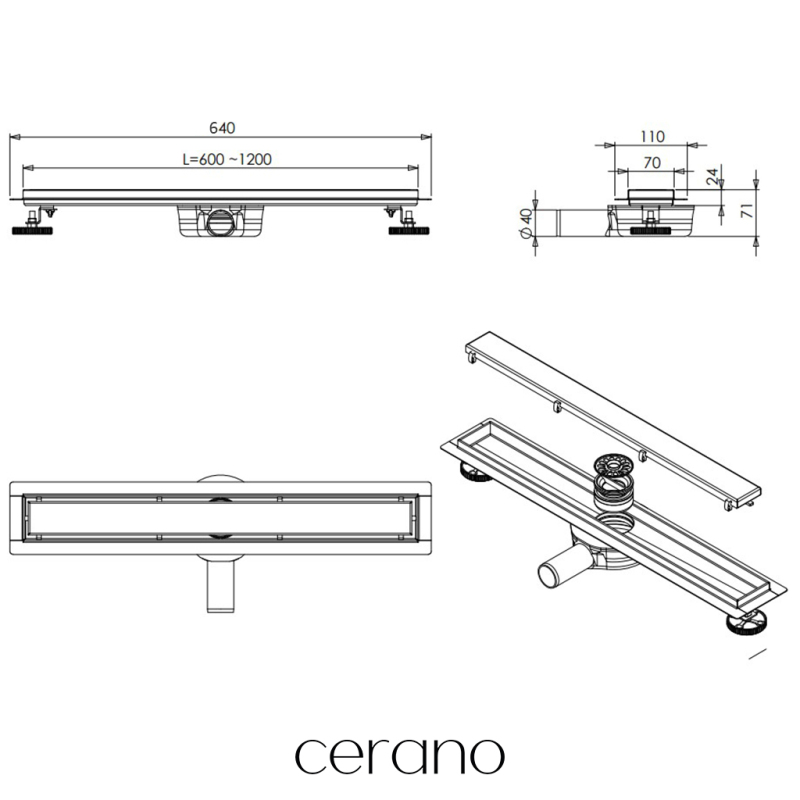 CERANO Lineární odtokový žlab se sif., otočný 360° design 2v1 černá matná 60cm CER-414932