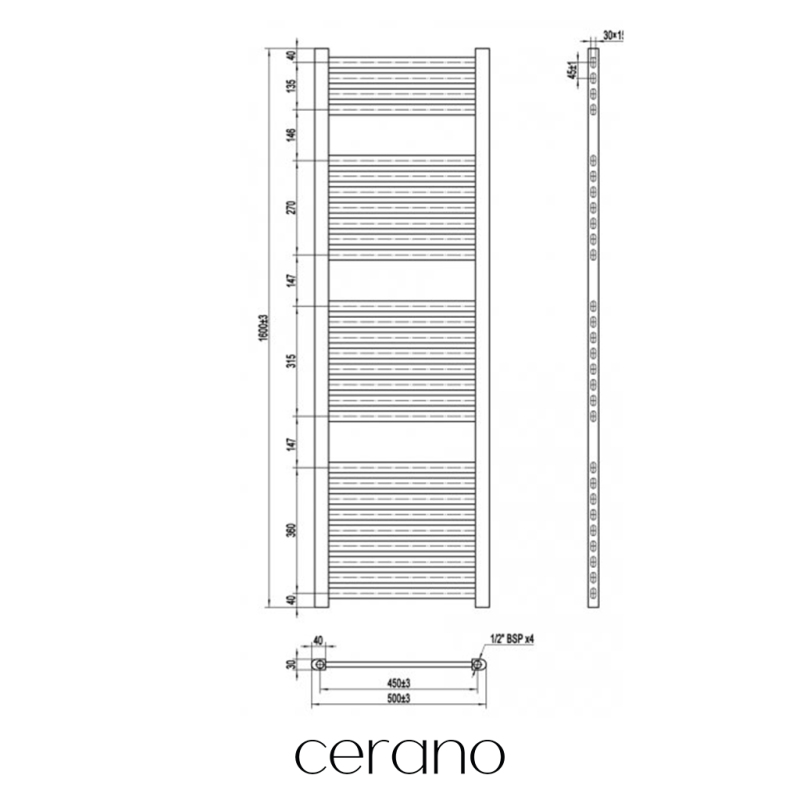 Standartní připojení radiátoru je 1/2" , což zajišťuje kompatibilitu s ventily a přípojnými sadami Cerano ,i od jiných výrobců. Ujistěte se, že všechny součásti odpovídají tomuto průměru, aby byl zajištěn bezpečný a efektivní provoz.