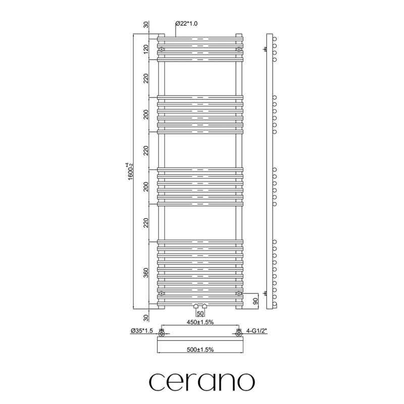 CERANO - Koupelnový radiátor Luigi - středové připojení 50mm - 713W - černá matná - 1600x500 mm