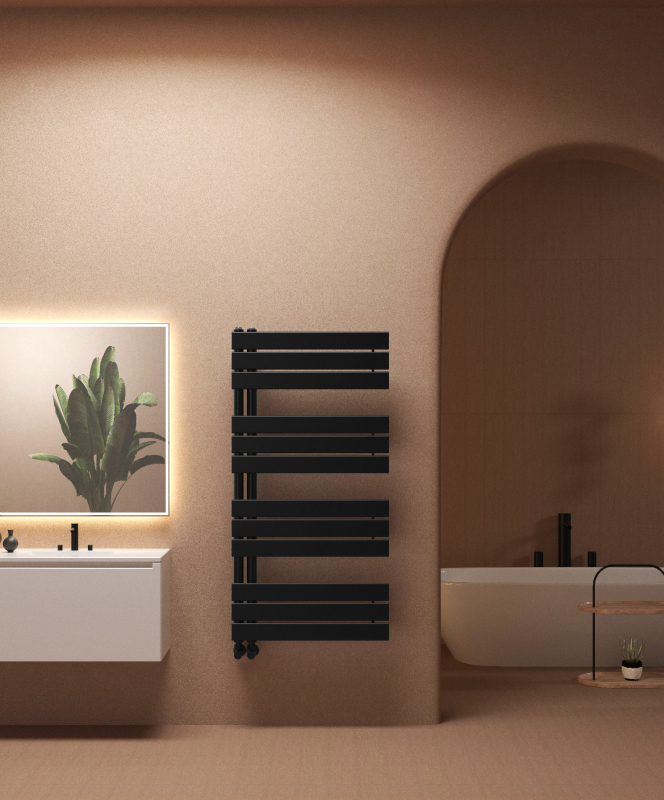 CERANO - Koupelnový radiátor Theo - L/P - asymetrické připojení 50mm - 650W - černá matná - 1200x500 mm