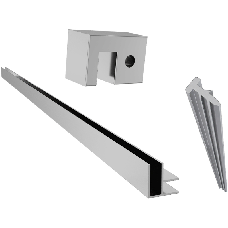 Kování a profily – kvalitní kování z hliníku, které slouží k bezpečné montáži skel. Profily jsou navrženy tak, aby perfektně lícovaly s povrchy a vytvářely čistý vzhled.