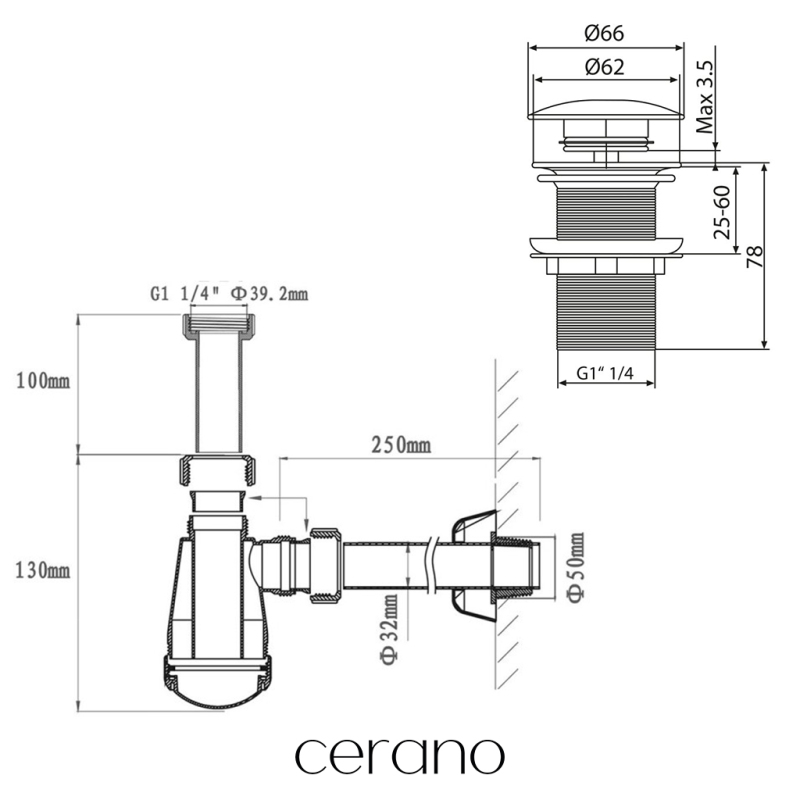 CERANO - Sifon umyvadlový - plast - DN32/40/50 s výpustí click-clack s přepadem - bílá