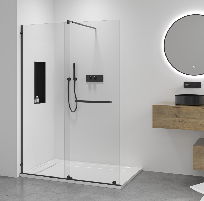 Cerano MEDIN je dvoudílná sprchová zástěna typu walk-in, která spojuje moderní design, bezbariérové provedení a chytré využití prostoru. Kombinace pevného skla a posuvného dílu umožňuje pohodlný vstup bez nároků na další prostor.