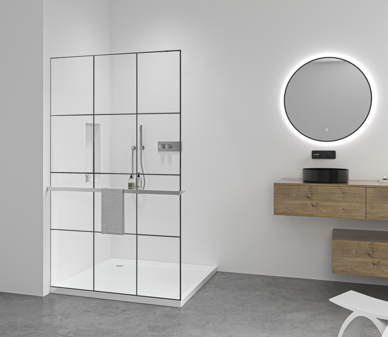 Díky promyšlené konstrukci je sklo uchyceno skrytě do profilů, které lze zapustit zcela nebo částečně ( až 14 mm do obkladů či dlažby). Bez rušivých vzpěr tak vzniká čisté, elegantní řešení, které podtrhne moderní vzhled koupelny a dodá prostoru maximální vizuální lehkost.