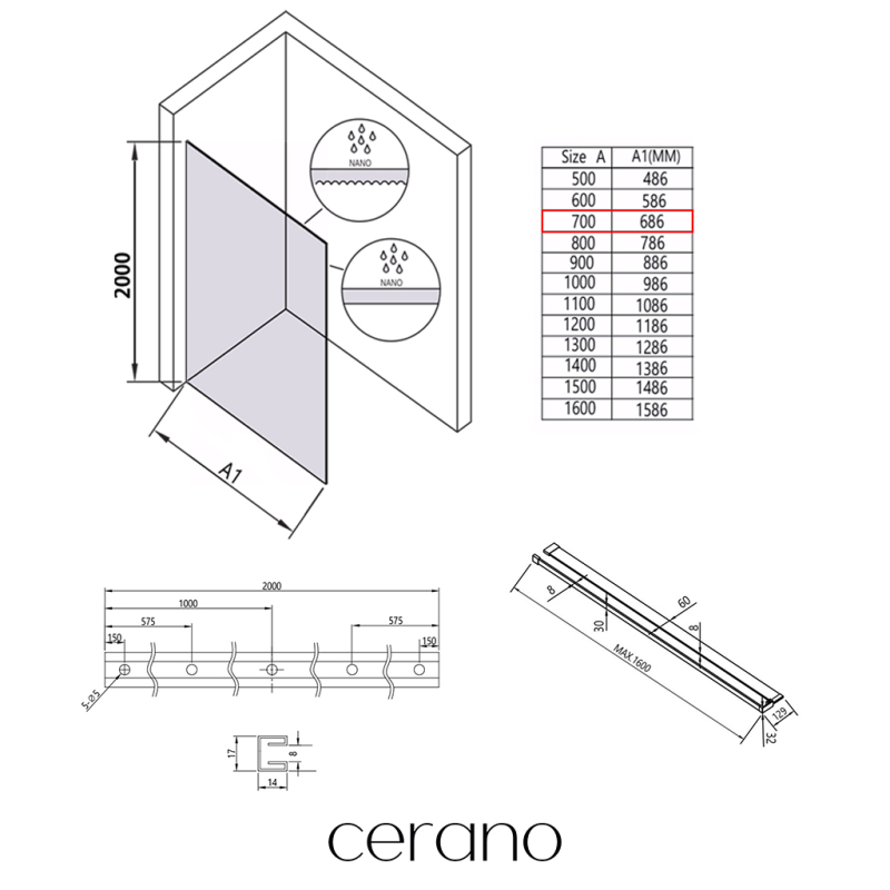 Sprchové zástěny CERANO Crystal jsou vybaveny odolnými nerezovými profily o výšce 200 cm, tloušťce 1,7 cm a hloubce 1,4 cm, které zajišťují pevné uchycení skla a stabilitu celé konstrukce. Díky kompenzaci drobných nerovností stěn je instalace rychlá, přesná a bez nutnosti dalších stavebních zásahů. Antikorozní úprava navíc garantuje dlouhou životnost i při každodenním používání v náročném koupelnovém prostředí.