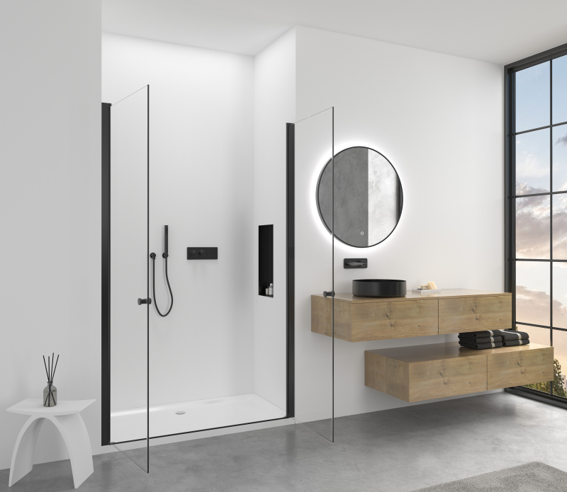 Dveře využívají křídlový systém otevírání, který je ideální pro moderní koupelny s dostatkem prostoru pro otevření dveřního křídla. Dveře jsou zavěšeny na zapuštěných pantech se systémem pneumatického přizvednutí.