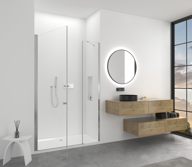 Dveře využívají křídlový systém otevírání, který je ideální pro moderní koupelny s dostatkem prostoru pro otevření dveřního křídla. Dveře jsou zavěšeny na zapuštěných pantech se systémem pneumatického přizvednutí.