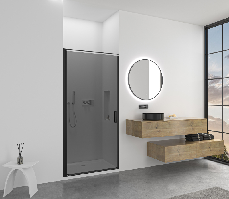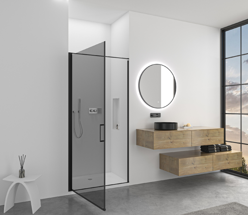Dveře využívají křídlový systém otevírání, který je ideální pro moderní koupelny s dostatkem prostoru pro otevření dveřního křídla. Dveře jsou zavěšeny na zapuštěných pantech se systémem pneumatického přizvednutí.