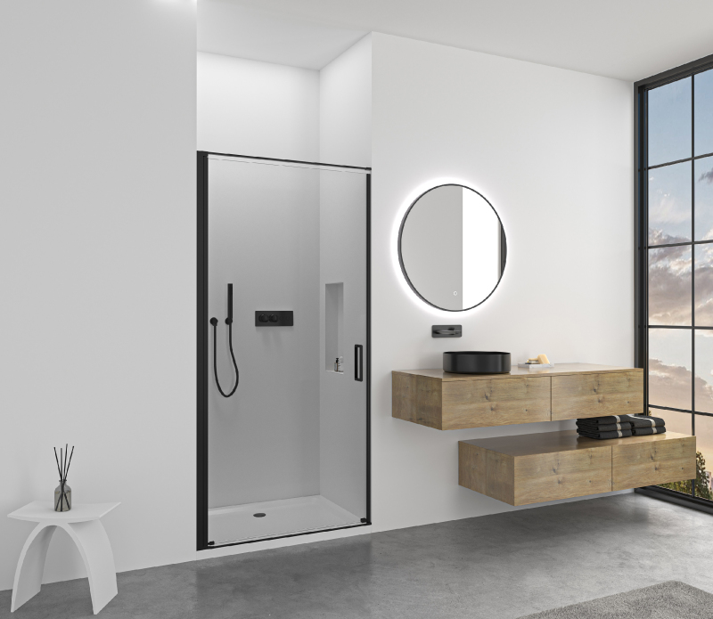 Dveře využívají křídlový systém otevírání, který je ideální pro moderní koupelny s dostatkem prostoru pro otevření dveřního křídla. Dveře jsou zavěšeny na zapuštěných pantech se systémem pneumatického přizvednutí.