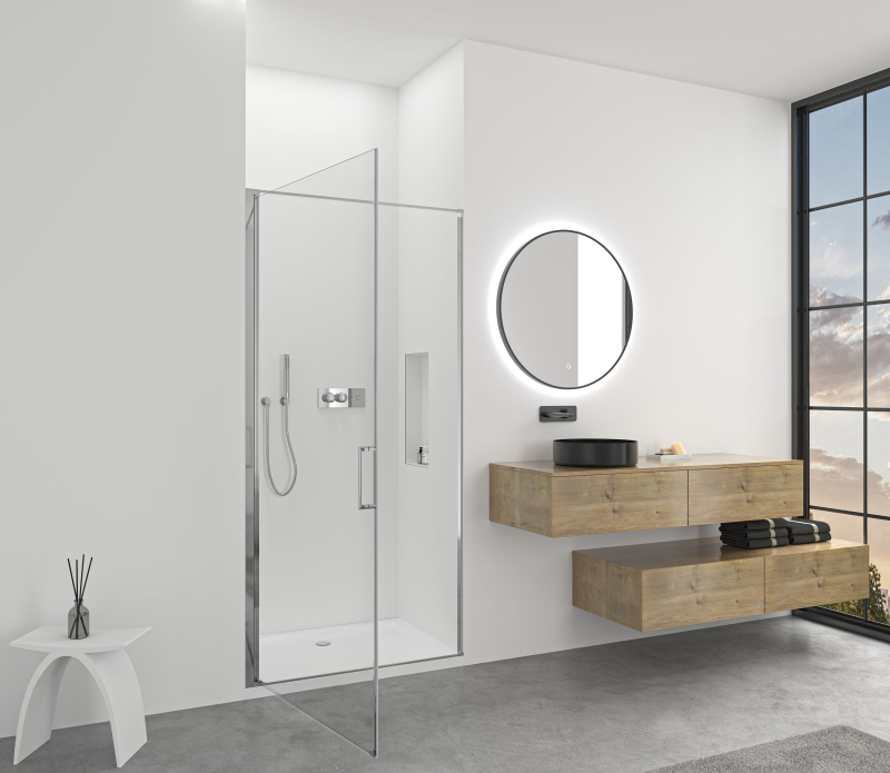 Dveře využívají křídlový systém otevírání, který je ideální pro moderní koupelny s dostatkem prostoru pro otevření dveřního křídla. Dveře jsou zavěšeny na zapuštěných pantech se systémem pneumatického přizvednutí.