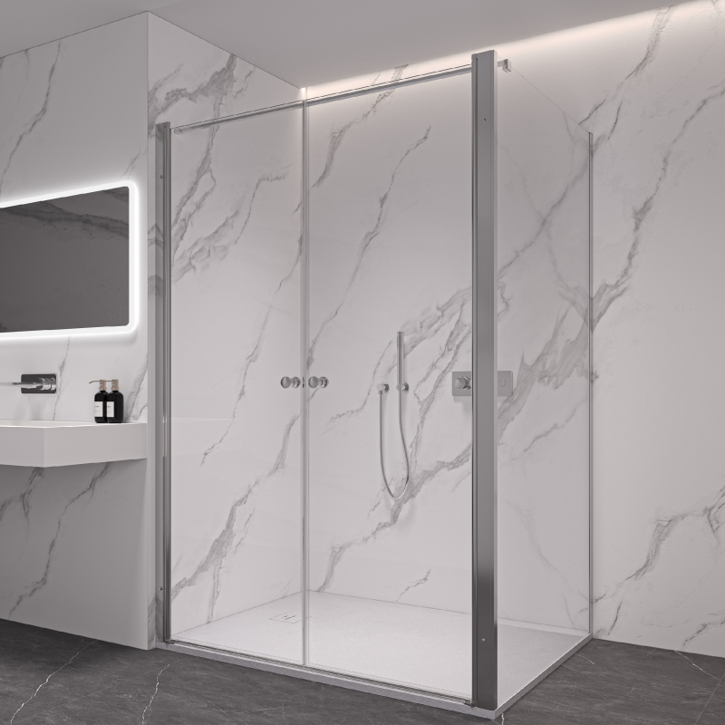 Dveře využívají křídlový systém otevírání, který je ideální pro moderní koupelny s dostatkem prostoru pro otevření dveřního křídla. Dveře jsou zavěšeny na zapuštěných pantech se systémem pneumatického přizvednutí.