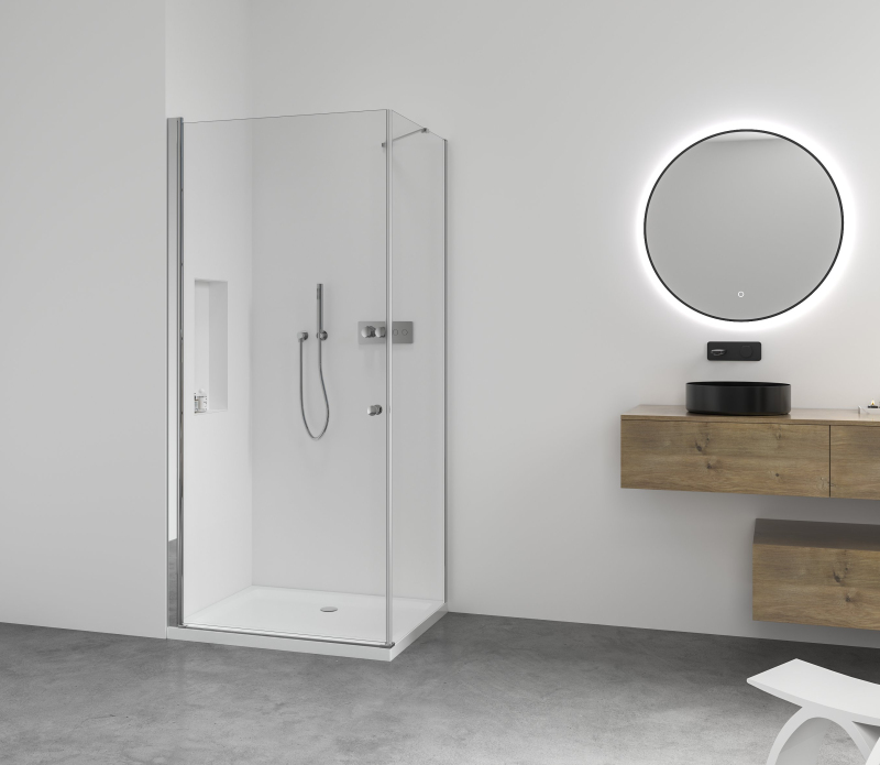 Dveře využívají křídlový systém otevírání, který je ideální pro moderní koupelny s dostatkem prostoru pro otevření dveřního křídla. Dveře jsou zavěšeny na zapuštěných pantech se systémem pneumatického přizvednutí.
