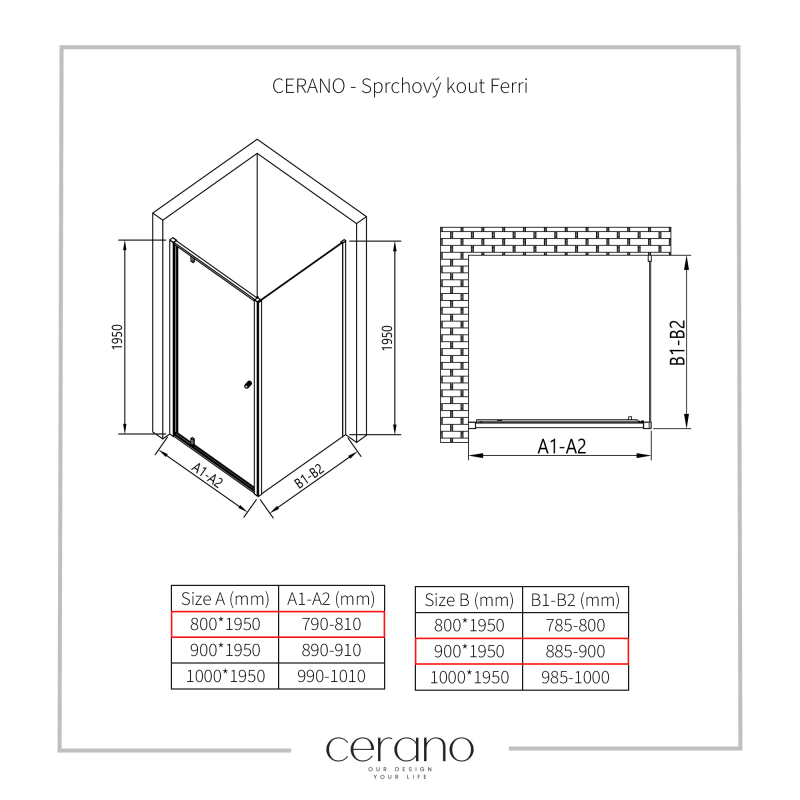 V rámci této série nabízíme širokou škálu rozměrů, abychom uspokojili různé potřeby našich zákazníků. Všechny sprchové kouty, dveře a zástěny značky CERANO jsou plně kompatibilní se sprchovými vaničkami CERANO ve stejných rozměrech, což zajišťuje bezproblémovou instalaci a dokonalé sladění. Sprchový kout lze navíc instalovat flexibilně – buď na odpovídající sprchovou vaničku, nebo přímo na podlahu podle vašich preferencí a možností koupelny.