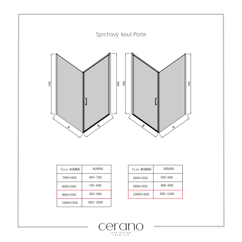 V rámci této série nabízíme širokou škálu rozměrů, abychom uspokojili různé potřeby našich zákazníků. Všechny sprchové kouty, dveře a zástěny značky CERANO jsou plně kompatibilní se sprchovými vaničkami CERANO ve stejných rozměrech, což zajišťuje bezproblémovou instalaci a dokonalé sladění. Sprchový kout lze navíc instalovat flexibilně – buď na odpovídající sprchovou vaničku, nebo přímo na podlahu podle vašich preferencí a možností koupelny.
