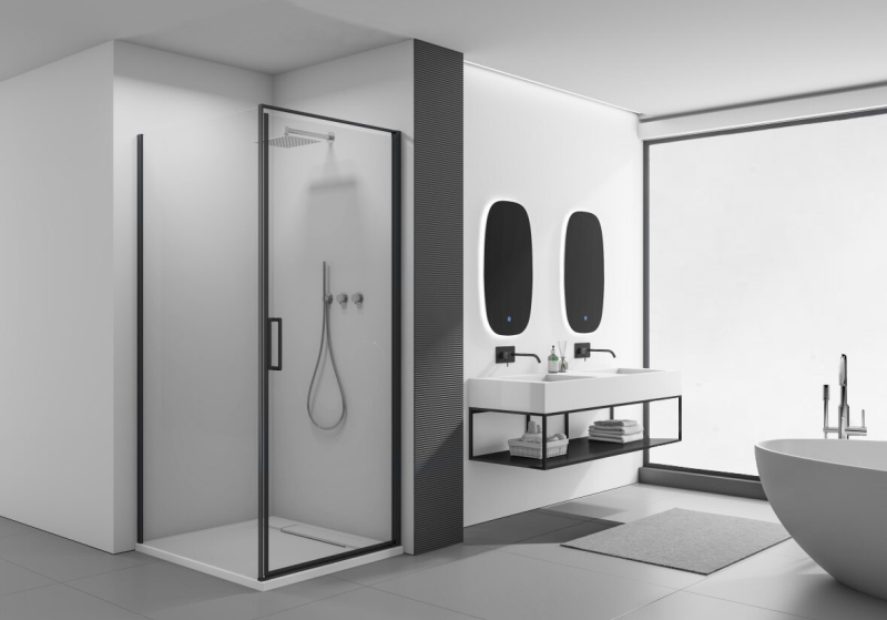 Dveře využívají křídlový systém otevírání, který je ideální pro moderní koupelny s dostatkem prostoru pro otevření dveřního křídla. Dveře jsou zavěšeny na zapuštěných pantech se systémem pneumatického přizvednutí.