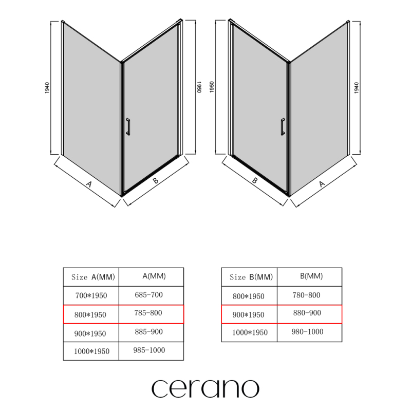 V rámci této série nabízíme širokou škálu rozměrů, abychom uspokojili různé potřeby našich zákazníků. Všechny sprchové kouty, dveře a zástěny značky CERANO jsou plně kompatibilní se sprchovými vaničkami CERANO ve stejných rozměrech, což zajišťuje bezproblémovou instalaci a dokonalé sladění. Sprchový kout lze navíc instalovat flexibilně – buď na odpovídající sprchovou vaničku, nebo přímo na podlahu podle vašich preferencí a možností koupelny.