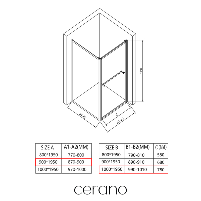 V rámci této série nabízíme širokou škálu rozměrů, abychom uspokojili různé potřeby našich zákazníků. Všechny sprchové kouty, dveře a zástěny značky CERANO jsou plně kompatibilní se sprchovými vaničkami CERANO ve stejných rozměrech, což zajišťuje bezproblémovou instalaci a dokonalé sladění. Sprchový kout lze navíc instalovat flexibilně – buď na odpovídající sprchovou vaničku, nebo přímo na podlahu podle vašich preferencí a možností koupelny.