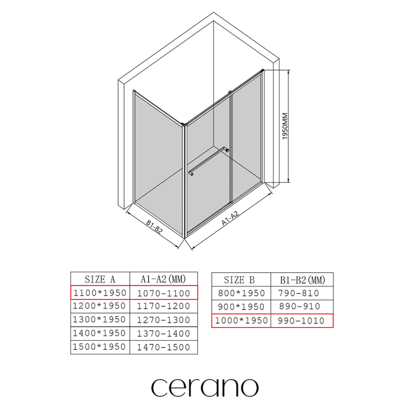 V rámci této série nabízíme širokou škálu rozměrů, abychom uspokojili různé potřeby našich zákazníků. Všechny sprchové kouty, dveře a zástěny značky CERANO jsou plně kompatibilní se sprchovými vaničkami CERANO ve stejných rozměrech, což zajišťuje bezproblémovou instalaci a dokonalé sladění. Sprchový kout lze navíc instalovat flexibilně – buď na odpovídající sprchovou vaničku, nebo přímo na podlahu podle vašich preferencí a možností koupelny.