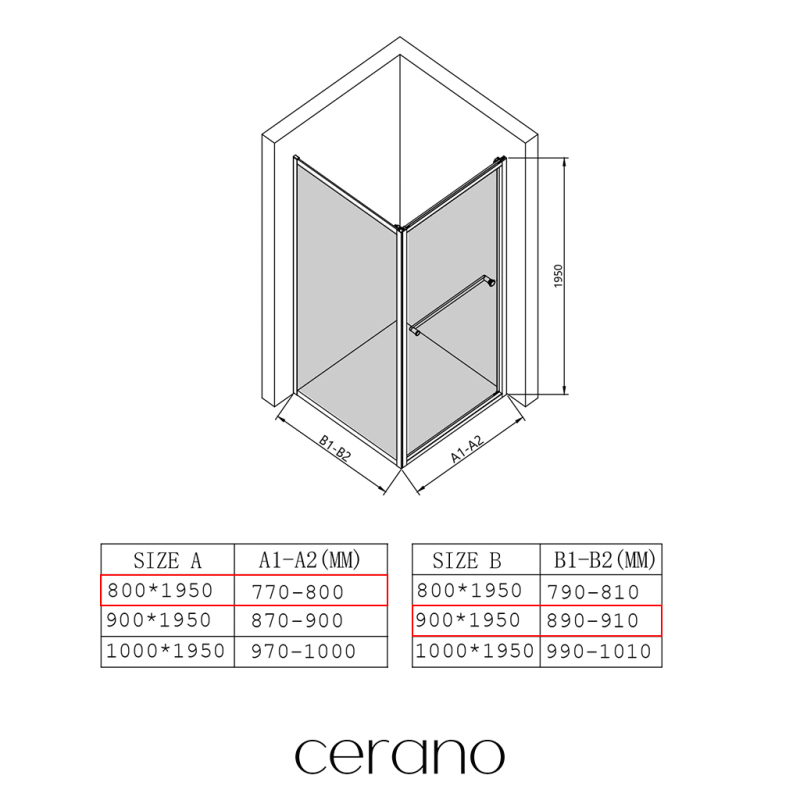 V rámci této série nabízíme širokou škálu rozměrů, abychom uspokojili různé potřeby našich zákazníků. Všechny sprchové kouty, dveře a zástěny značky CERANO jsou plně kompatibilní se sprchovými vaničkami CERANO ve stejných rozměrech, což zajišťuje bezproblémovou instalaci a dokonalé sladění. Sprchový kout lze navíc instalovat flexibilně – buď na odpovídající sprchovou vaničku, nebo přímo na podlahu podle vašich preferencí a možností koupelny.