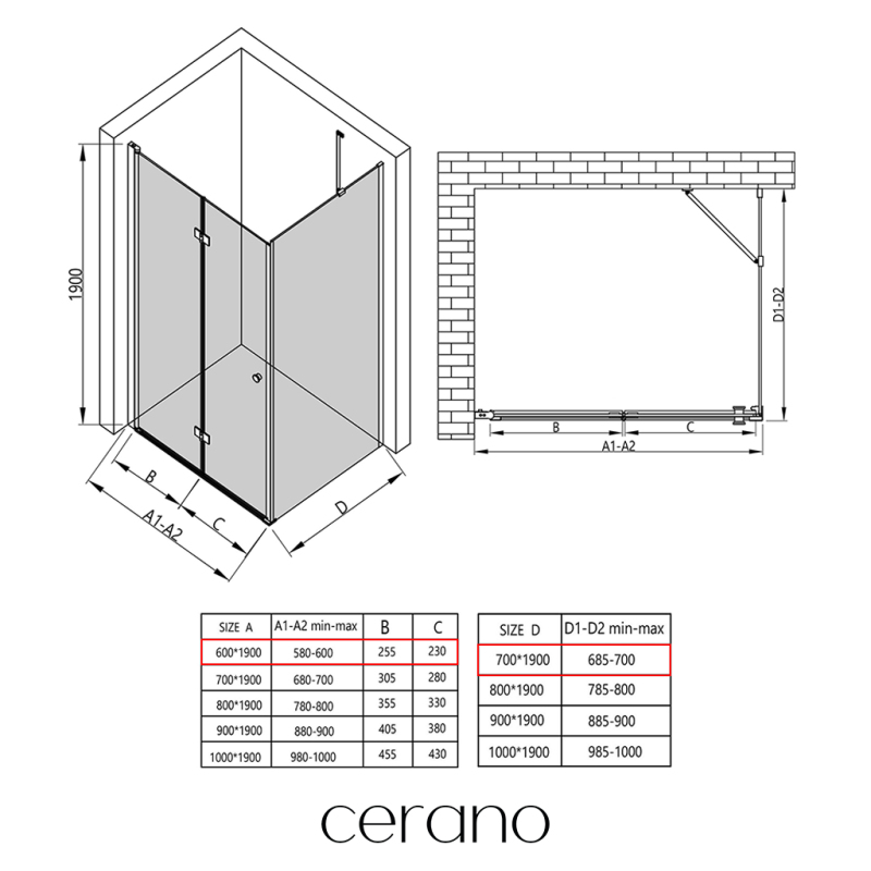 V rámci této série nabízíme širokou škálu rozměrů, abychom uspokojili různé potřeby našich zákazníků. Všechny sprchové kouty, dveře a zástěny značky Cerano jsou plně kompatibilní se sprchovými vaničkami Cerano ve stejných rozměrech, což zajišťuje bezproblémovou instalaci a dokonalé sladění. Sprchový kout lze navíc instalovat flexibilně – buď na odpovídající sprchovou vaničku, nebo přímo na podlahu podle vašich preferencí a možností koupelny.