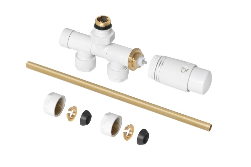 Jedná se o sadu pro dolní připojení radiátoru, která obsahuje úhlové prvky pro levou/pravou stranu a rovné prvky pro levou/pravou stranu. Tato sada umožňuje také použití elektrického topného tělesa v konfiguraci s radiátorem.