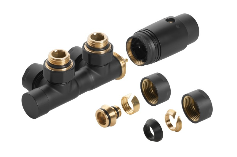 - Spojuje přívod a zpátečku (tedy oba otvory radiátoru) do jednoho kompaktního kusu.