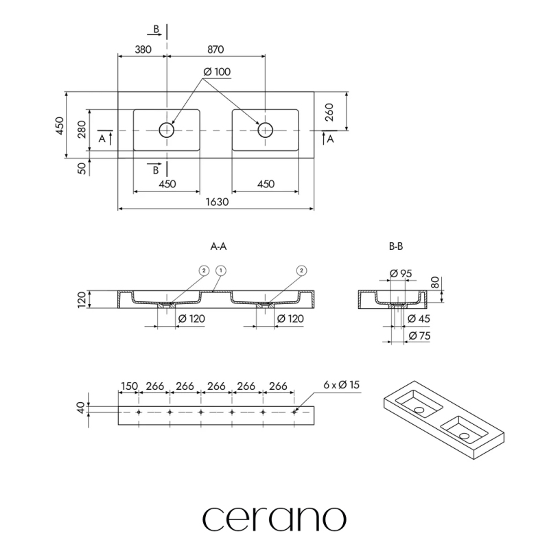 CERANO - Umyvadlo z litého mramoru Geminia - nástěnné - bílá matná - 163x45 cm