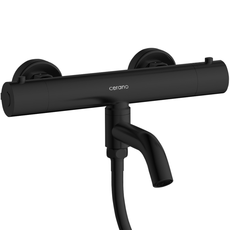 CERANO - Vanová nástěnná baterie Selma s příslušenstvím - termostatická - otočný výtok - černá matná