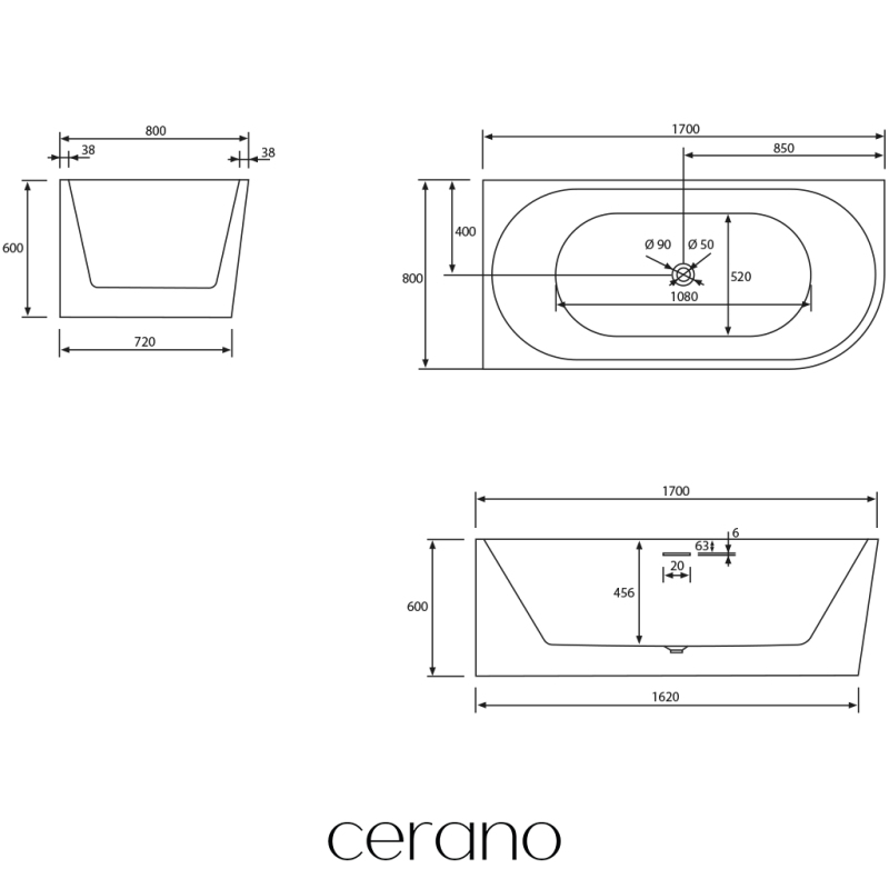 CERANO - Volně stojící akrylátová vana Bianco, levá - bílá lesklá - 170x80 cm
