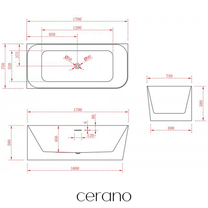 CERANO - Volně stojící akrylátová vana Brilante, levá - bílá lesklá - 170x75 cm