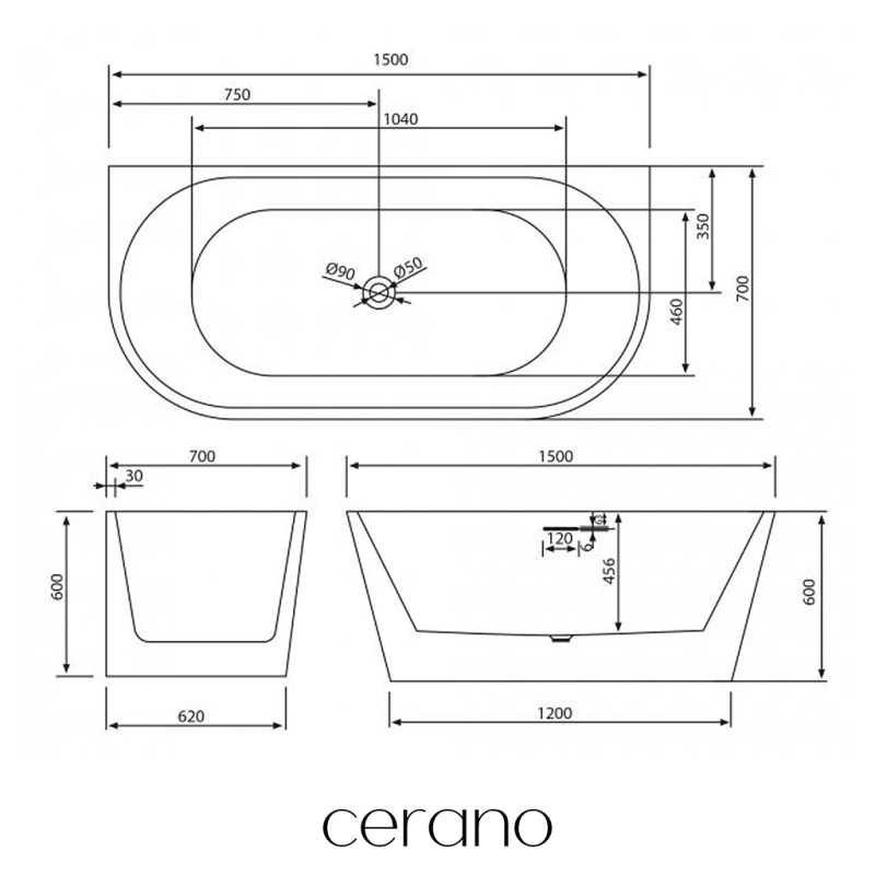 CERANO - Volně stojící akrylátová vana Grazia - bílá lesklá - 150x70 cm