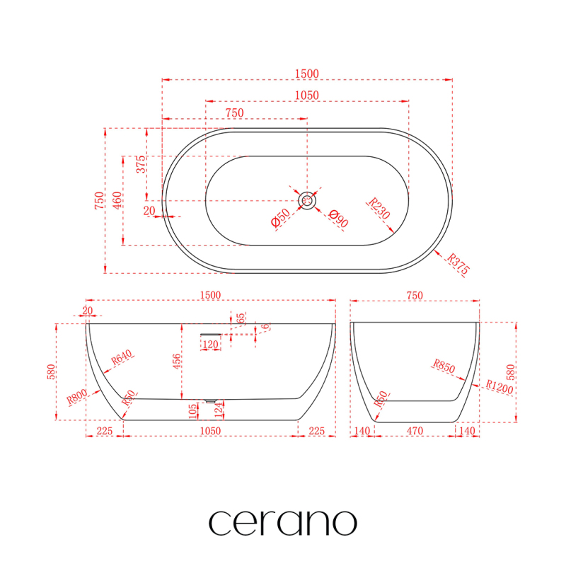 CERANO - Volně stojící akrylátová vana Menora - bílá lesklá - 150x75 cm