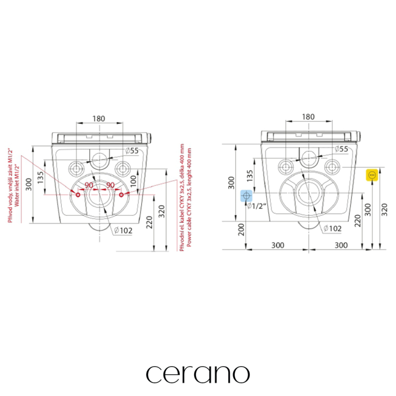 Závěsné WC mísy Cerano se snadno montují díky svým univerzálním rozměrům. Jsou kompatibilní k systémům od známých značek jako Cerano,Geberit, Grohe a Schwab. Díky tomu může být naše WC bez obtíží instalováno do většiny stávajících instalačních rámů, které jsou na trhu.