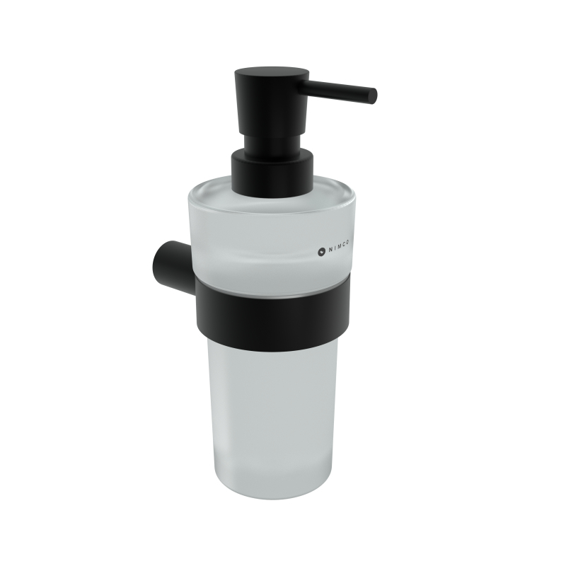 Nástěnný dávkovač tekutého mýdla. Pumpička mosazná s černou povrchovou úpravou. Nádobka z matného skla, 250 ml.